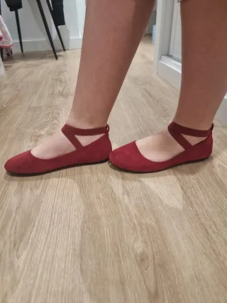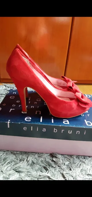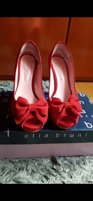 Elegantes zapatos de tacón peep toe en color rojo, adornados con un coqueto lazo. - Destacar sin un número 38 pero calzan grandes equivalen a un 39. - Diseño abierto en la punta. - Material de ante. - Tacón de aguja.