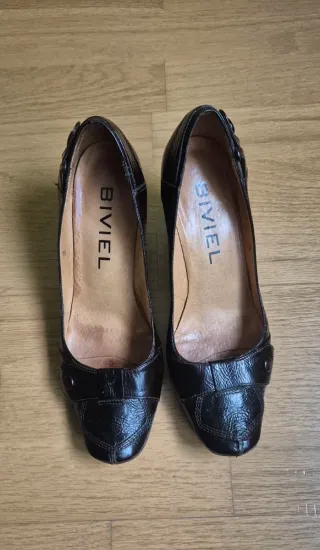 Elegantes zapatos de tacón de la marca Biviel. - Color marrón oscuro. - Diseño clásico con detalle en la punta. - Tacón de altura media.