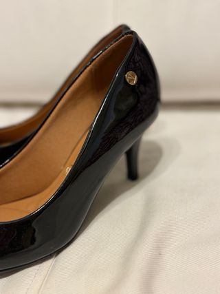 Elegantes zapatos de charol en color negro. - Diseño de punta fina. - Tacón de altura media. - Detalle metálico con logo en el talón. -aconchado en la parte delantera - suela nueva