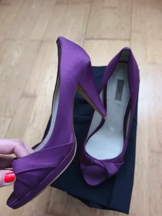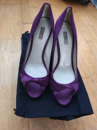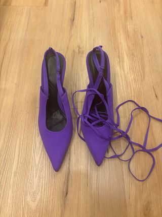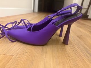 Elegantes zapatos de tacón de Zara en color morado. Perfectos para añadir un toque de color a cualquier atuendo. - Diseño de punta fina. - Cierre con tiras para atar al tobillo. se pueden utilizar sin cintas. - Un solo uso - Tacón de altura media.