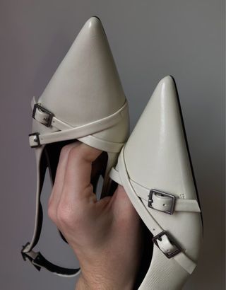Zapatos de tacón bajo tipo kitten, en color crema, con punta a pico, correa ajustable, abiertos por detrás, de la marca Pull & Bear, talla 38 y usados solo una vez.