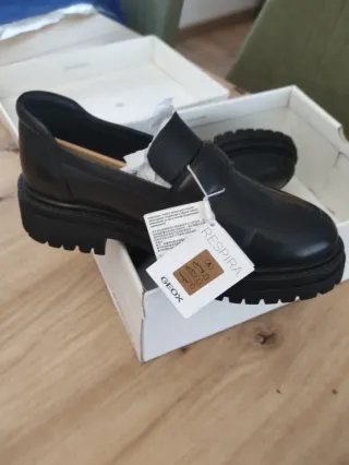 Mocasines negros de la marca Geox, a estrenar. - Diseño moderno con suela gruesa. - Acabado liso en piel. - Cierre sin cordones.