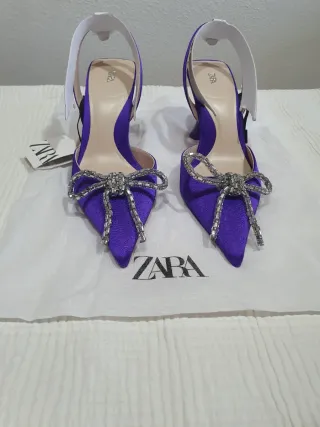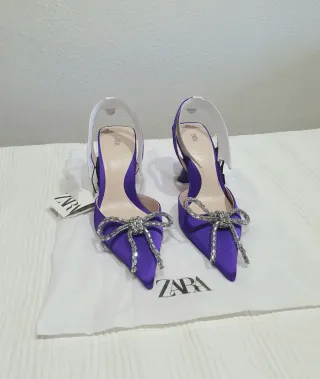 Elegantes tacones morados con un detalle de lazo adornado con brillantes. #tacones #morados #zapatos #talla37 #plateado #zapatosmujer #37