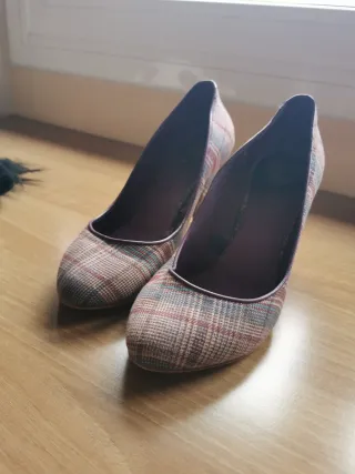 Elegantes zapatos de tacón con un diseño de cuadros en tonos morados y otros colores. La marca no me acuerdo creo que eran del extradibaris - Diseño de cuadros. - Acabado en tela.
