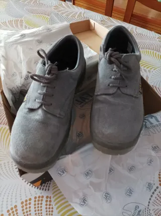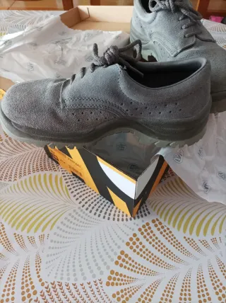 Zapatos de seguridad en color gris, talla 38. Se entregan en su caja original. - Material exterior de ante. - Cierre con cordones. - Suela de goma.