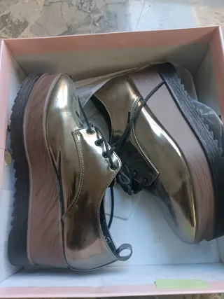 Zapatos de plataforma con un acabado metalizado brillante. - Diseño tipo Oxford. - Suela gruesa de plataforma. - Cierre con cordones.