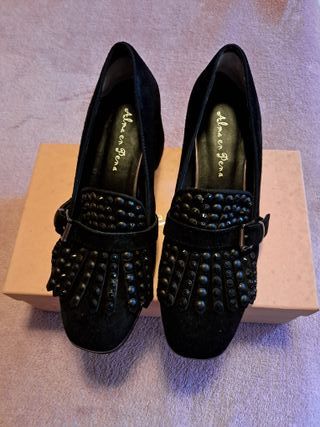 Elegantes zapatos de tacón de la marca Alma en Pena. - Diseño en ante negro-. - Adornados con tachuelas y flecos. - Muy poco usados (puestos tres veces) -Incluyo caja no en perfecto estado. -Clickar fotos para ver mejor-
