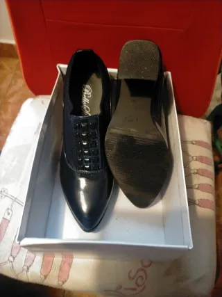 Elegantes zapatos salón azul marino de tacón salón. Sin estrenar, se compraron para un evento, donde al final se usó otro calzado, se les puso tapa y suela antideslizantes nuevas por esa razón. Dan talla, son un 38,5. No los he llegado ni a estrenar debido a que empecé a llevar plantillas especiales. - Diseño de punta redonda. - Detalle de lazo con logo dorado. - Acabado brillante en la puntera. - Interior con logo de la marca.