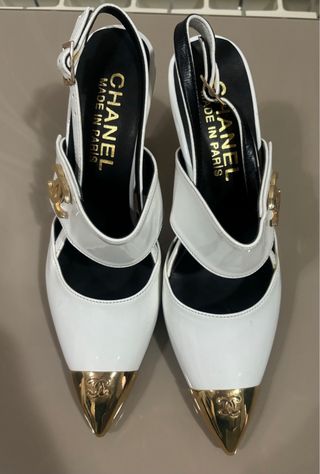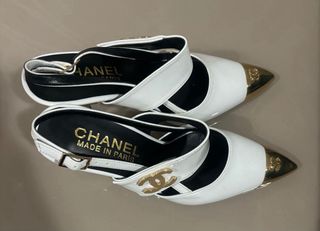 Elegantes zapatos de tacón de la marca Chanel. - Diseño slingback. - Punta reforzada en dorado. - Detalle de logo CC en el lateral. - Correa ajustable al tobillo. -No rebajo