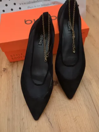 Elegantes zapatos de salón con un diseño moderno y sofisticado. - Acabado en ante. - Detalle de cadena dorada en el talón. - Punta fina.