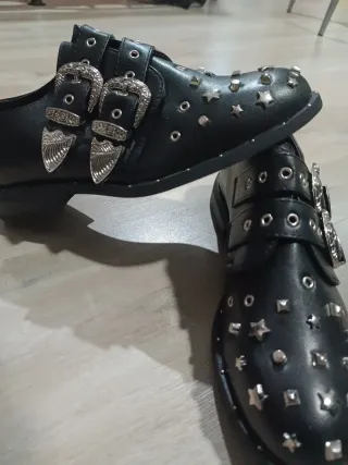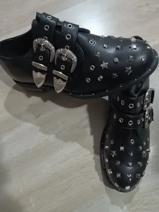 Zapatos negros con un diseño único y llamativo. - Adornados con tachuelas plateadas en forma de estrellas y círculos. - Cuentan con dos hebillas plateadas decorativas en la parte superior. - Detalle de flecos plateados en las hebillas.