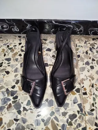 NUEVOS SIN ESTRENAR Elegantes zapatos negros con un diseño moderno. - Detalle de hebilla plateada. - Punta fina. - Tacón cómodo