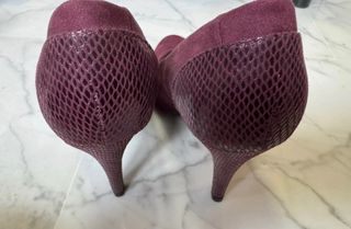 Elegante conjunto de zapatos de tacón de punta y cartera a juego. Estiletos de zara de piel vuelta granate, destalonados y con tacón imitación piel de serpiente. Altura del tacón, 10 cm. Cartera sobre de mango con la misma imitación de piel de serpiente