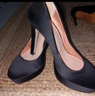 Elegantes zapatos de tacón de satén. - Color negro. - Talla 36. - Marca H&M. Tacón 10 cm Plataforma delantera 3 cm Solo una puesta