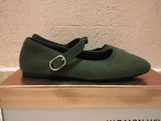 Zapatos planos de color verde oliva o verde cacería. Talla 38. Modelo tipo Mary Jane. COMPLETAMENTE NUEVOS. SIN ESTRENAR. Tejido tipo antelina. Diseño con tira y cierre de hebilla.