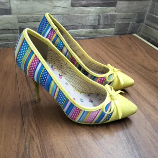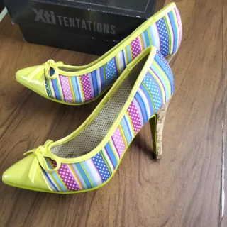 Zapatos de charol amarillo con un diseño llamativo y colorido, loneta multicolor, nuevos, puestos en una ocasión, núm 36. - Detalle de lazo en la punta. - Tacón con acabado de corcho. - Estampado de rayas y lunares.