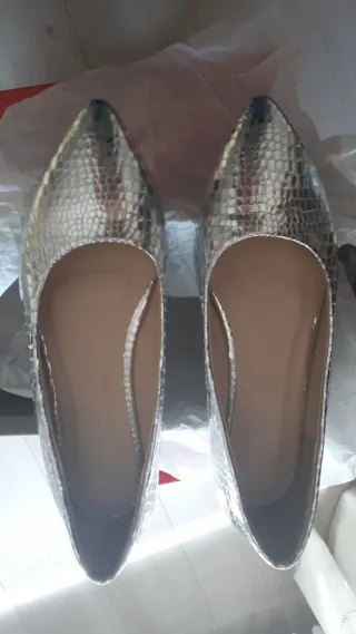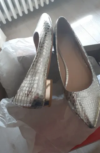Preciosos zapatos talla 39, aunque yo creo que calzan algo menos, para Nsvidad celebraciones, comuniones, bodas ....plateados y el tacón dorado. puestos dos horas, así que están prácticamente nuevos