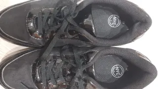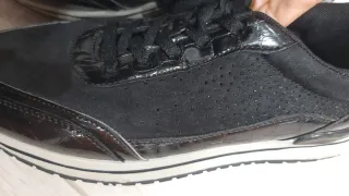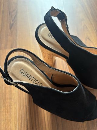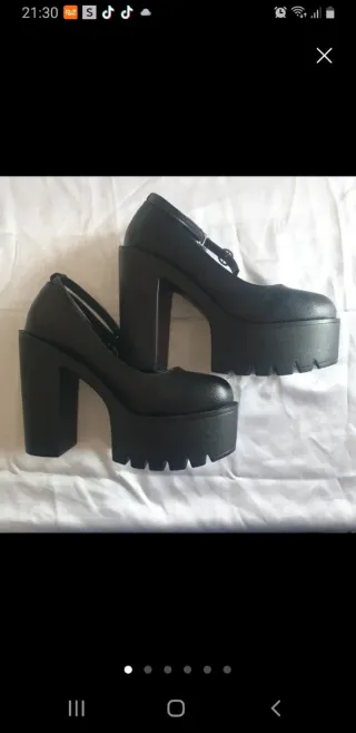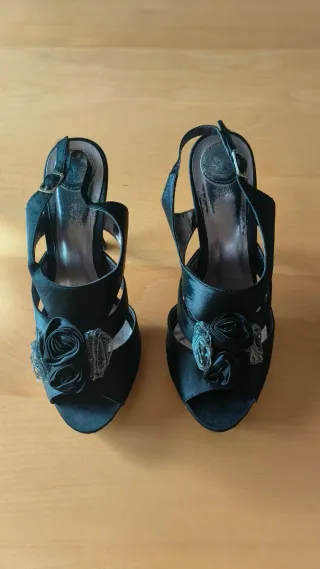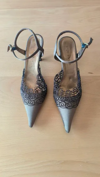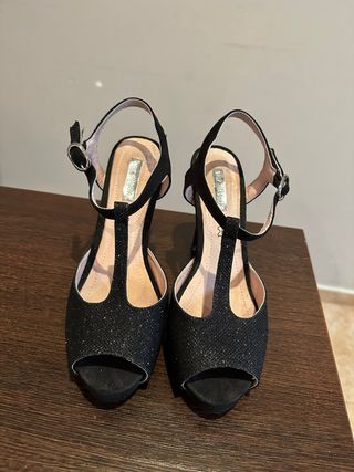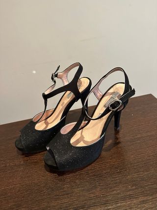 Elegantes zapatos de tacón con un diseño llamativo. - Acabado texturizado en negro y dorado. - Correa ajustable al tobillo. - Punta fina. Estan prácticamente nuevos ,como se aprecia la suela,solamente me los he puesto un par de veces para 2 ocasiones especiales..son zapatos de buena calidad,pero ya me es imposible llevar tacones por una rotura de tobillo.Brillan mucho son elegantes y para cualquier ocasión especial son perfectos!!