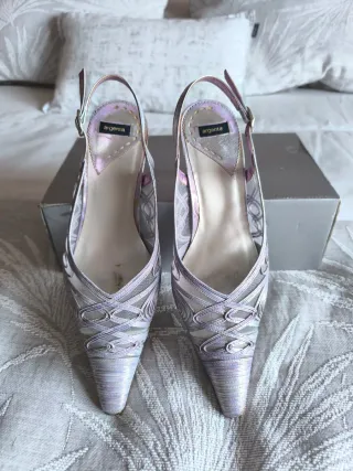 Elegantes zapatos de tacón con un diseño brillante. Tacón fino de 12cm. Puestos solo 2 veces pero la parte interior de la correa de ambas se deshace supongo que por el paso del tiempo.