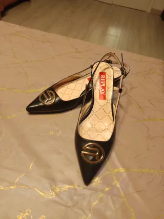 Elegantes zapatos destalonados de la marca Replay. - Diseño de punta afilada. - Detalle de logo dorado en la pala. - Tira fina en el tobillo con cierre de hebilla. Puestos solo para probar en casa.