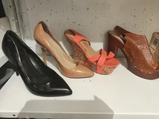 Lote de zapatos de tacón de diferentes estilos y colores. - Zapato negro de charol. - Zapato beige de tacón fino. - Sandalia naranja con cuña de esparto. - Zapato marrón tipo peep-toe con plataforma. Algunos están sin estrenar y otros más que como nuevos precio por el conjunt. SIN ENVIOS