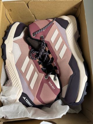 Zapatos de senderismo Adidas Terrex para mujer. - Diseño en tonos rosa y negro. - Tecnología RAIN.RDY para protección contra la lluvia. - Suela con agarre TERREX.