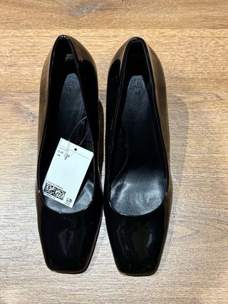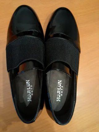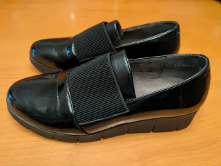 Elegantes y cómodos zapatos de charol con detalle elástico. - Color negro. - Talla 39 - Acabado brillante.
