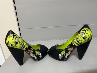 Zapatos de tacón TUK con un diseño llamativo. - Color negro con detalles en verde lima. - Estilo peep toe. - Logo de la marca en la plantilla.