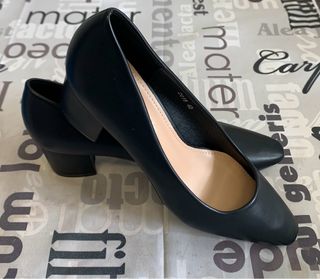Elegantes zapatos de tacón sin estrenar, en su caja y con sus bolsas de protección. Son negros, con tacón ancho, elegantes y cómodos. - Diseño de punta fina. - Tacón grueso y robusto. - Acabado satinado.