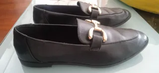 Elegantes mocasines para mujer. - Diseño clásico. - Detalle metálico dorado en la pala. - Acabado liso. - Con mínimos desgastes por uso, como se ve en foto, de ahí precio