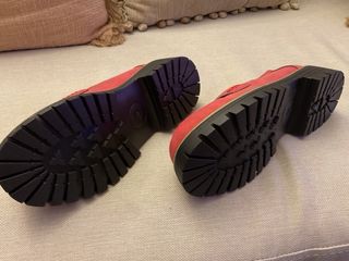 Zapatos tipo mocasín en color rojo, sin estrenar. - Diseño con antifaz. - Suela gruesa y dentada. - Costuras decorativas en contraste.