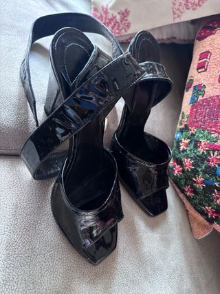 Elegantes zapatos de tacón de Zara en color beige y acabado charol. - Diseño de punta fina. - Tacón grueso y estable. - Logo de la marca en la plantilla.