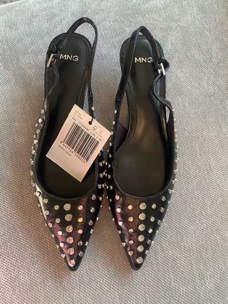 Elegantes zapatos destalonados de Mango con un diseño moderno y llamativo. - Acabado en negro. - Detalle de tachuelas plateadas. - Punta fina. - Correa ajustable en el talón. - Tacón kitten.