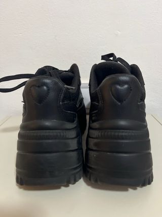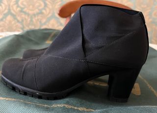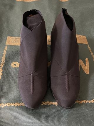 Zapatos de tacón bloque supercómodos ya que al tener un poco de plataforma delante no se nota la altura. Son negros con pequeños detalles en marrón que los hace diferentes. Sin de tipo abotinado Solo tiene un pequeño roce en el zapato derecho casi imperceptible una vez puesto. Se ve en la última foto