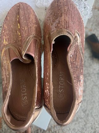 Preciosos zapatos de plataforma, ideales para una ocasión especial. ✨ - Son de color plata y tienen un diseño elegante. - Están fabricados con un material brillante y atractivo. - Se encuentran en buen estado, con ligeras señales de uso.