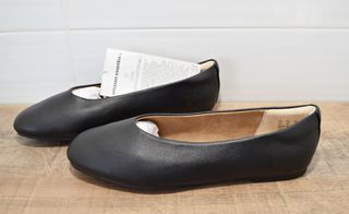 - Elegantes bailarinas planas, de tipo básico, en color negro. De la talla 39 EU. - Diseño plano y ajustado, fabricadas en material con textura de piel, con interior en tono marrón claro y una plantilla acolchada con espuma viscoelástica de alta calidad para mayor comodidad, así como una almohadilla en el talón para aliviar la presión y evitar su deslizamiento. - Nuevas a estrena. Con etiquetas. Se entregan en una caja diferente a la original.