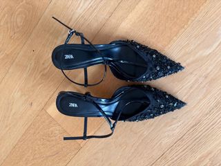 Elegantes zapatos de tacón de Zara, perfectos para ocasiones especiales. - Diseño de punta afilada. - Adornados con pedrería y lentejuelas. - Tiras finas y pulsera al tobillo. - Tacón fino.