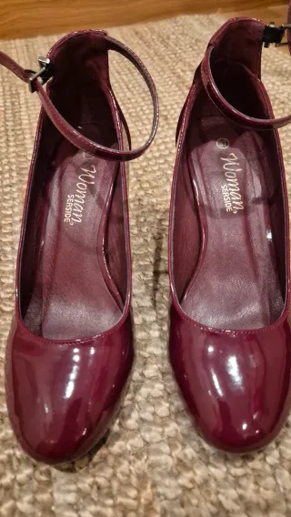 Elegantes zapatos de charol en tono burdeos, perfectos para complementar tu atuendo. - Diseño con pulsera al tobillo. - Acabado brillante. - Marca Woman Seaside.