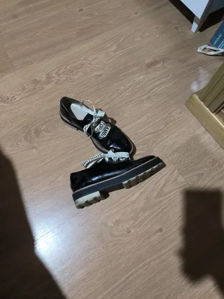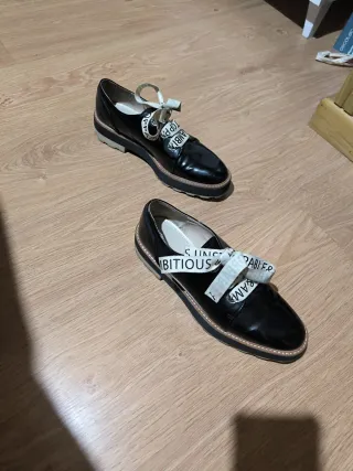 Zapatos de charol negros de Zara con detalle de cinta. - Diseño de cordones. - Suela gruesa. - Cinta con texto decorativo.