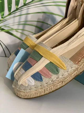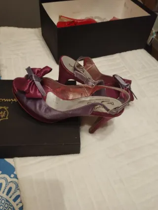 Sin estrenar. Zapatos de tacón con suela e interior en piel, por fuera tienen un tejido multicolor muy bonito.