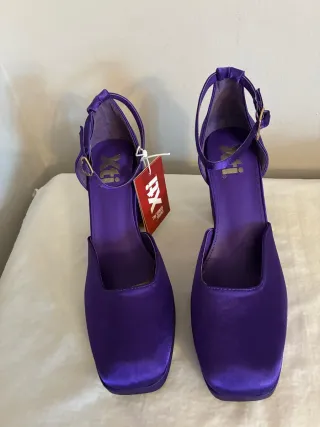 Zapatos de plataforma morados. Cerrados en el talón y cierre de pulsera. - Medida interna 25,5 centímetros. -Material tela.