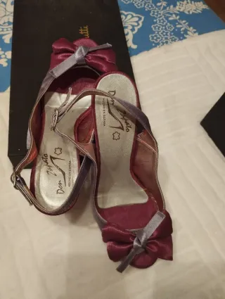 Zapatos de plataforma. Cerrados en talón, y sujeción con pulsera. Color violeta. - Medida interior: 25,5 centímetros. -Material tela