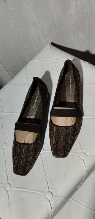 Zapatos planos están nuevos están hechos con tela que llevan el nombre de la marca Adolfo Domínguez