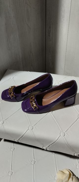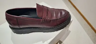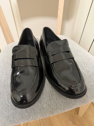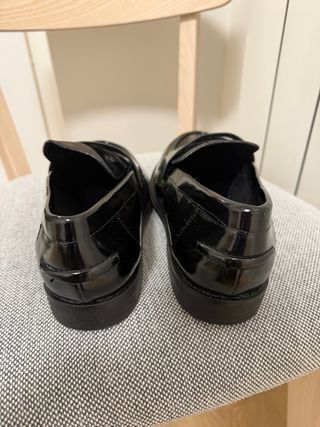 Zapatos tipo mocasín con acabado charol y tacón + plataforma delantera. - Diseño elegante y moderno. - Cierre con cordones. - Tacón grueso y estable. Poco uso, están bien conservados.