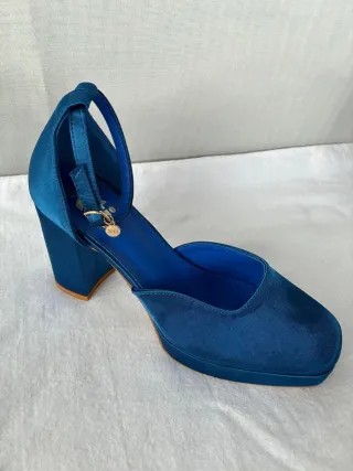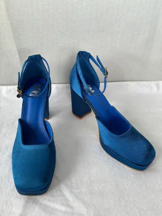 Zapatos de plataforma de tela, color azul. Sujeción de pulsera en tobillo. - Medidas de alto del tacón 9,5 cm. Plataforma: 2 cm. Medida interior: 25,5 cm.