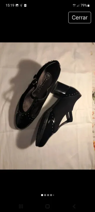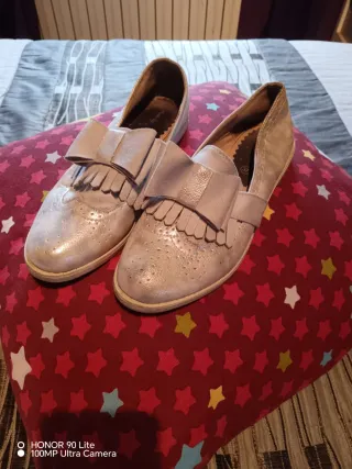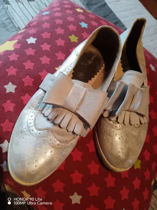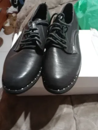 Elegantes zapatos estilo colegial de charol. - Diseño con flecos y detalle de perlas. - Cierre de cordones. IMPORTANTE tienes que tener el pio algo estrecho por qué están sin estrenar y al principio apretaran un poco pero después ya se estiraran