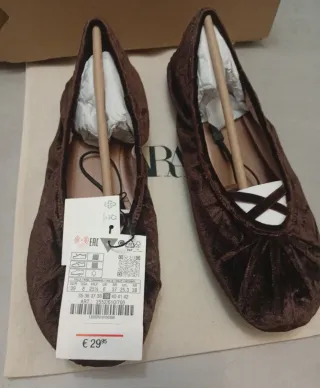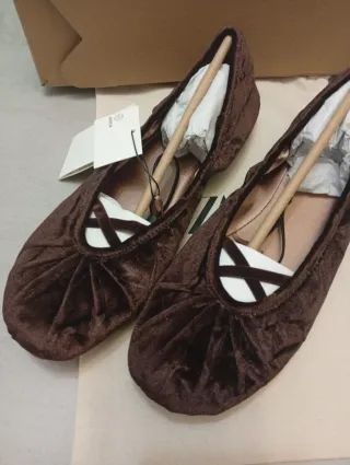 Elegantes bailarinas de Zara en color marrón, confeccionadas en terciopelo. - Diseño fruncido en la punta. - Tira cruzada en el empeine.