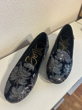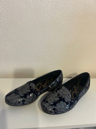 Elegantes zapatos planos con un diseño llamativo. - Marca: Callaghan - Talla: 37 - Acabado aterciopelado. - Detalles de lentejuelas. - Estampado floral.