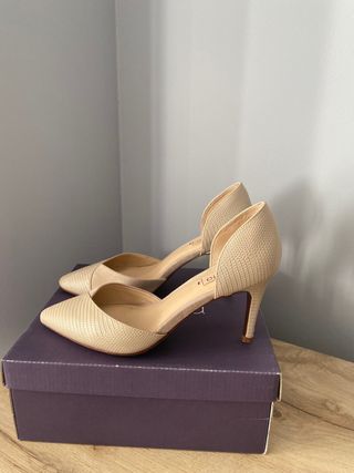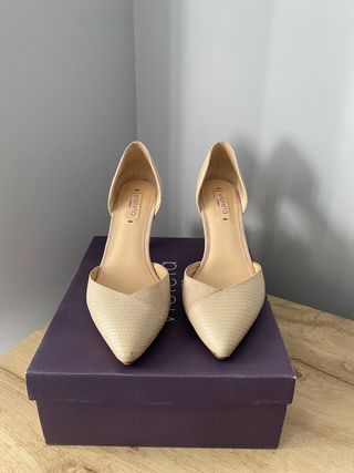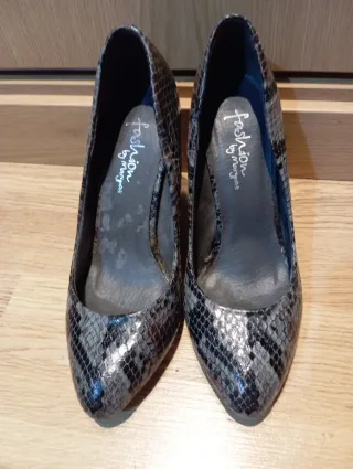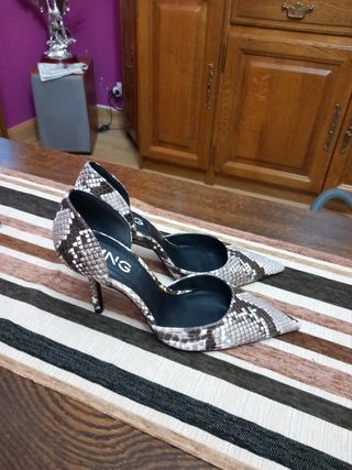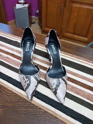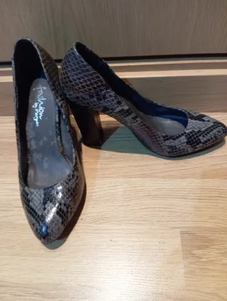 Elegantes zapatos tipo salon con un tacón intermedio (6,5 cm) que tiene una plataforma interna no visible en la parte delantera que le resta como un centrimetro. - Estampado de serpiente en tonos beige ,marrón oscuro y marrón piedra. - Diseño de punta redonda. - Suela cómoda para caminar. -Poco usados, alguna ligera rozadura que apenas se aprecia por el propio dibujo del zapato. -Faciles de combinar con ropa o complementos de tonos similares.