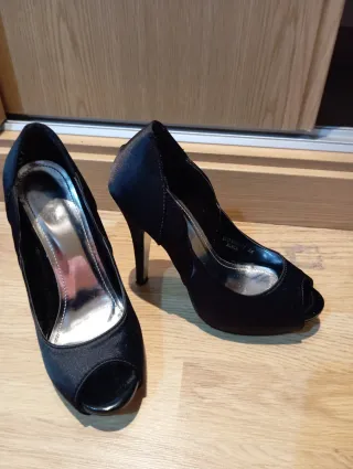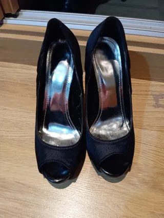 Elegantes zapatos de tacón negros con pulsera al tobillo. - Material exterior tipo ante. - Pulsera ajustable con hebilla. - Tacón alto y plataforma,super cómodos..ideales fiestas Buen estado poco uso como se ve..tapitas tacón repuesto...12€